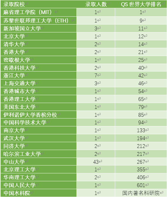 目前,已被世界前50名的著名大学录取的永利官网2022届本科毕业生有23人,深造高校包括排名世界第一的麻省理工学院(MIT),以及苏黎世联邦理工大学(ETH)、新加坡国立大学、清华大学、北京大学、香港大学、密歇根大学等顶尖名校。另外,有28人被排名世界前100名著名大学录取,升学深造本科毕业生中有94%比例的同学在排名世界前300名著名学府深造。