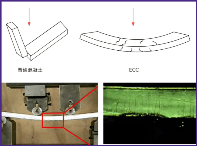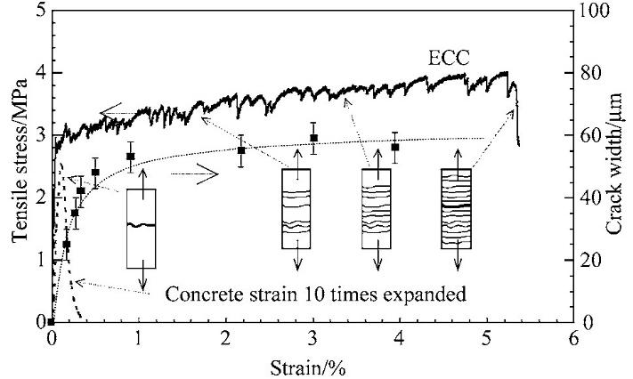 工程水泥基复合材料(Engineered Cementitious Composites,简称ECC)是基于微观力学设计,在拉伸或剪切荷载下呈现高延展性的一种材料。与普通纤维增强混凝土不同,ECC拉伸初裂后的非弹性变形中呈现多缝开裂,是一种具有高韧性和优异抗裂性能的材料。独特的配比设计和纤维的加入(如聚乙烯纤维),使其具备良好的延展性和自愈合能力。