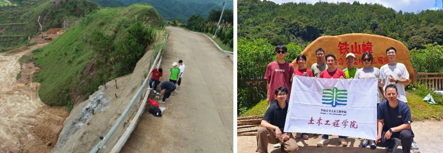 6月27日上午,师生们前往当地的一处废弃矿山——铁山嶂,调研山区地质状况与生态修复进展。铁山嶂曾为当地铁矿开采区域,矿产资源丰富,数十年的露天采矿行为致使山体破坏严田,大量植被遭破坏,土壤、水体也受到严出污染,裸露创而影响范围面积超过平方公里。2021年4月,铁山嶂项目被列人国家山水林田湖草一体化保护和修复项目,获得中央专项资金支持。在地质灾害治理、生态复绿、污水处理等工程一体推进下,如今的铁山峥面貌焕然一新,生态体系功能也在逐步恢复当中。铁山嶂作为当地生态修复的名片,进一步评估其治理成效和因地制宜探索合理利用方案对促进当地可持续发展具有重要意义。在矿山现场,师生利用无人机进行全方位的观测和摄影,结合专业知识,分析讨论山区地质灾害的防护措施;利用地质雷达对部分点位进行现场检测,对矿区多个位置的表层土质进行了采样,以便后续进行更深入的分析。无人机航拍画面显示,曾经的露天采矿区已经覆土,新植的绿草点缀在山体间,建造的8座重力式拦挡坝有效控制泥石流,减轻灾害风险,保障沿岸群众的安全。