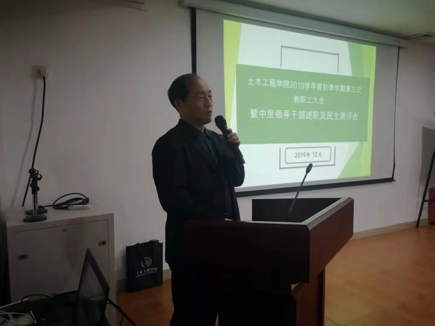 接下来,王复明院长做学院2019年度工作总结并作个人述职。他着重汇报了五个方面的内容:学院学科方向规划、学位点建设与人才培养、团队建设与管理模式创新、科研平台建设及重点科技项目。2019年,学院再次召开学科发展论证会议,明确6个学科方向,将宽口径、厚基础、复合型 “大土木”专业人才作为培养目标。创新团队建设方式、优化学院管理职能;通过学校新增博士学位授权点审核,在学科建设方面取得重大进展;坚持立德树人,人才培养质量得到全面提升;扎实推进三大建设,工程医院、河南研究院等成为学院建设重要依托平台;承担多项重点项目,科研经费进账、科技奖励等进步明显。王复明院长勉励全体教职工再接再厉,推进学院各项工作来年迈上新的台阶。