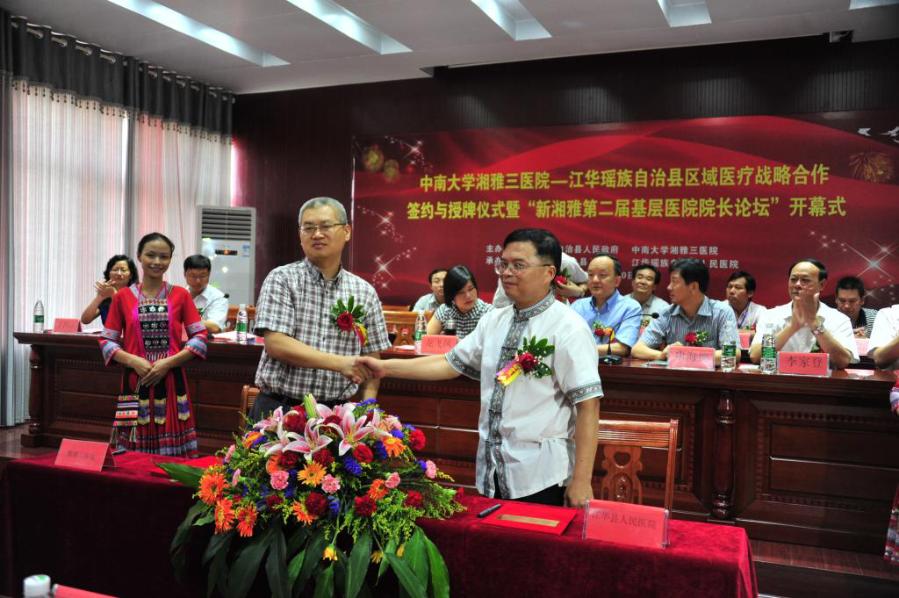 2013年6月19日,beat365正版唯一官网必一湘雅三医院为江华县人民医院授牌“beat365正版唯一官网必一湘雅三医院技术指导医院”,与江华县人民政府签署医疗帮扶战略协议,与江华县人民医院签署医疗帮扶合作协议,拉开健康扶贫的序幕。