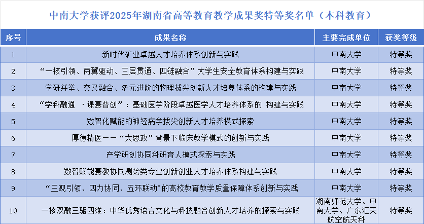 湖南省教学成果奖是由省教育厅设立的教学领域最高荣誉,旨在表彰和推广全省教育系统的优秀教学与教研成果,激发广大教师投身教学改革创新,为加快推进教育强省建设提供支撑。2025年湖南省高等教育教学成果共499项,其中特等奖50项、一等奖175项、二等奖274项。