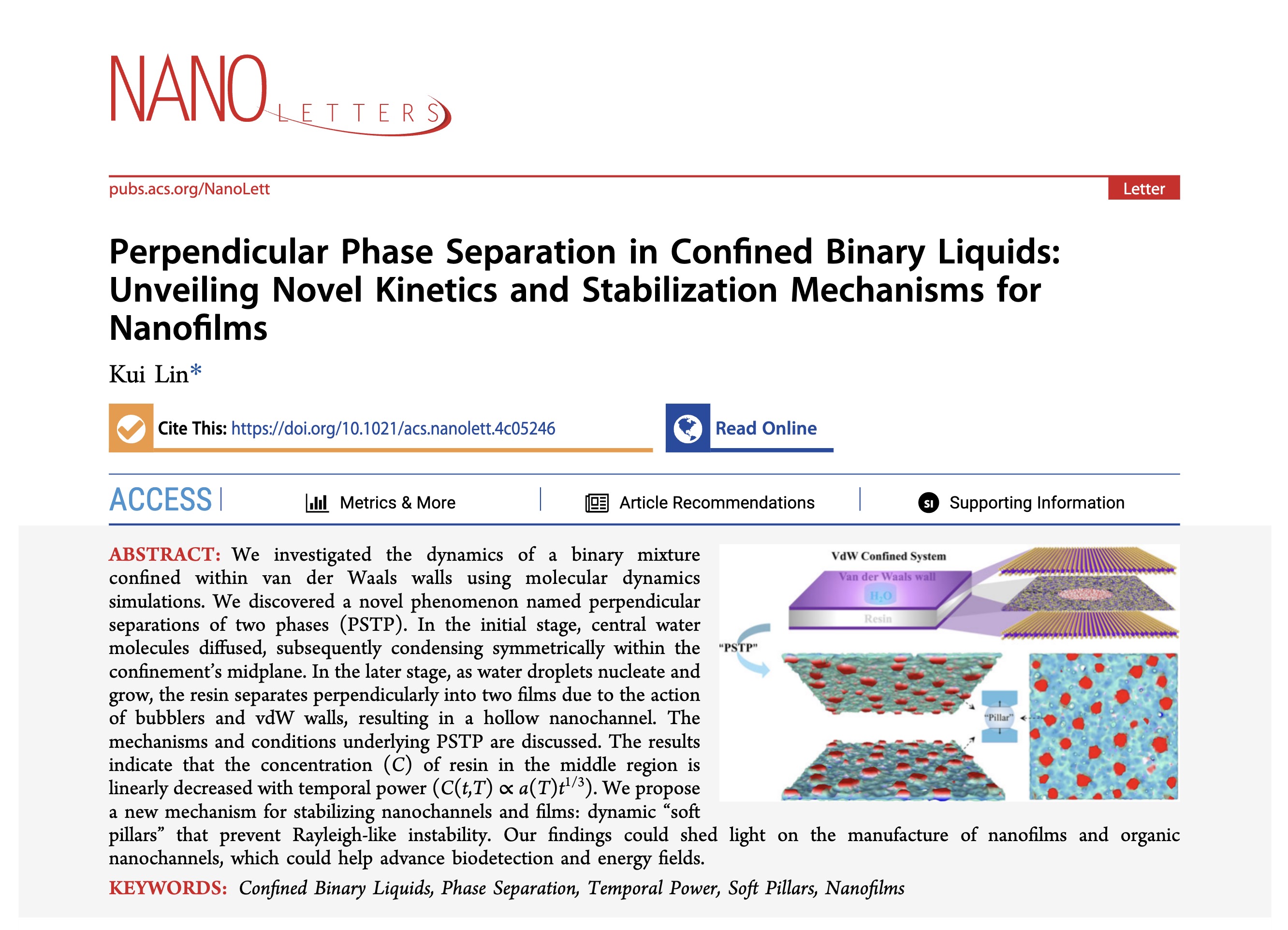 - Kui Lin*. Perpendicular phase separation in confined binary liquids: Unveiling novel kinetics and stabilization mechanisms for nano-films, Nano Letters, 25(1), 470-475 (2025).(Q1, Nature Index 期刊, 封面论文, Citations: 1 ) https://doi.org/10.1021/acs.nanolett.4c05246